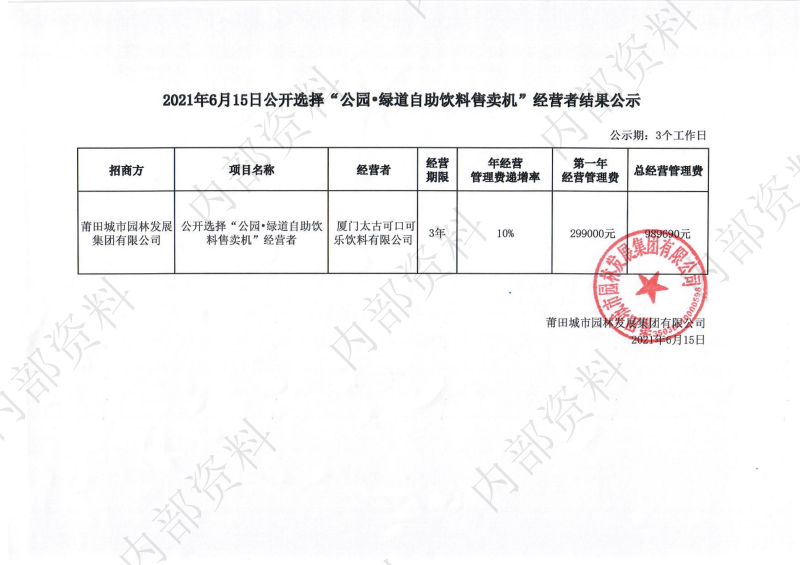 2021年6月15日公開選擇“公園?綠道自助飲料售賣機(jī)”經(jīng)營者結(jié)果公示